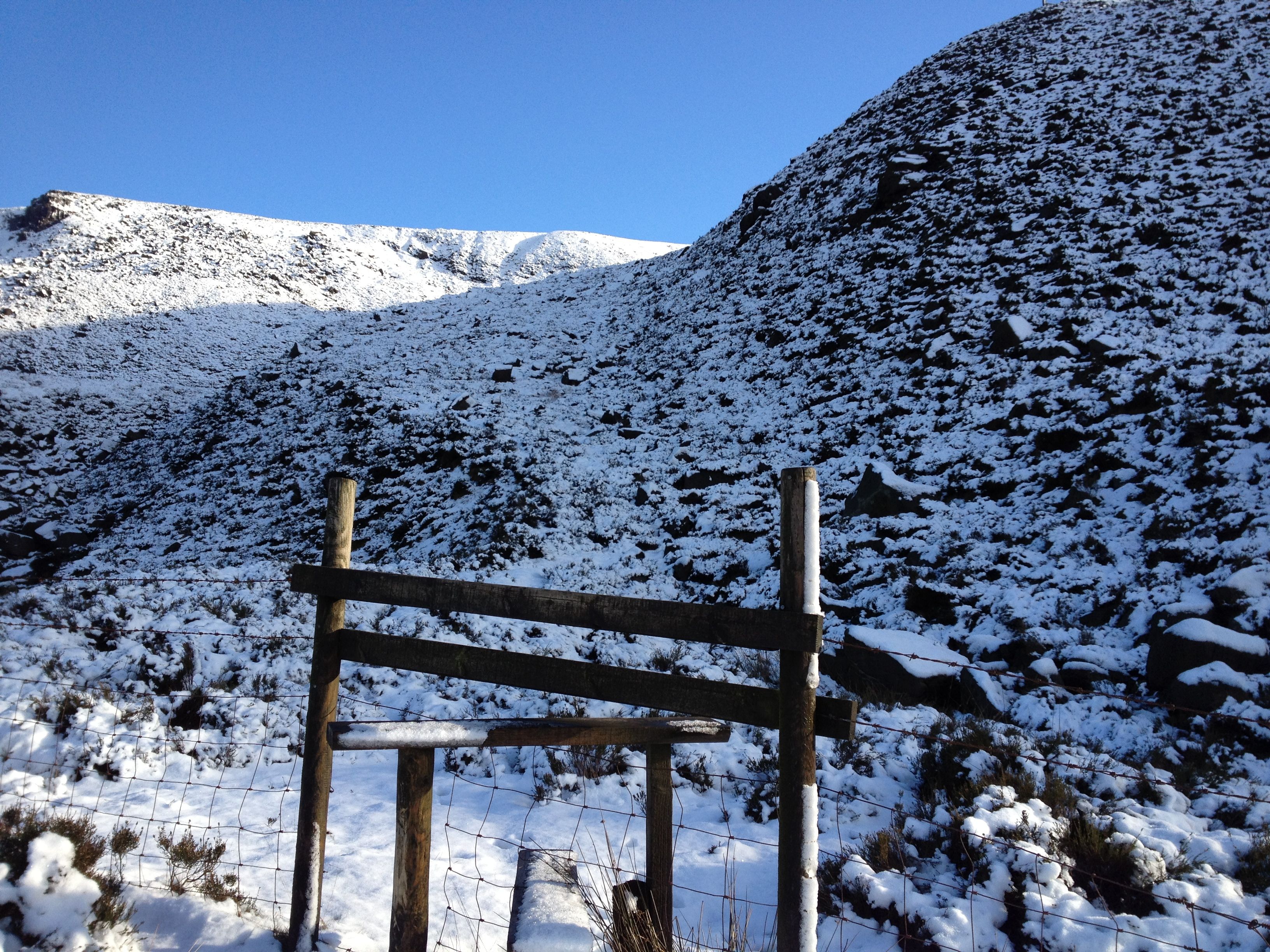 Compared to my previous outing in the Lake District 13 days earlier, just setting out from Marsden indicated that this was going to be a much trickier route underfoot. Ice and deep frost covered the track alongside the reservoirs and whilst I was able to set a good pace, the conditions demanded respect. Still, nothing above shoe-level, and the A635 was reached relatively easily.