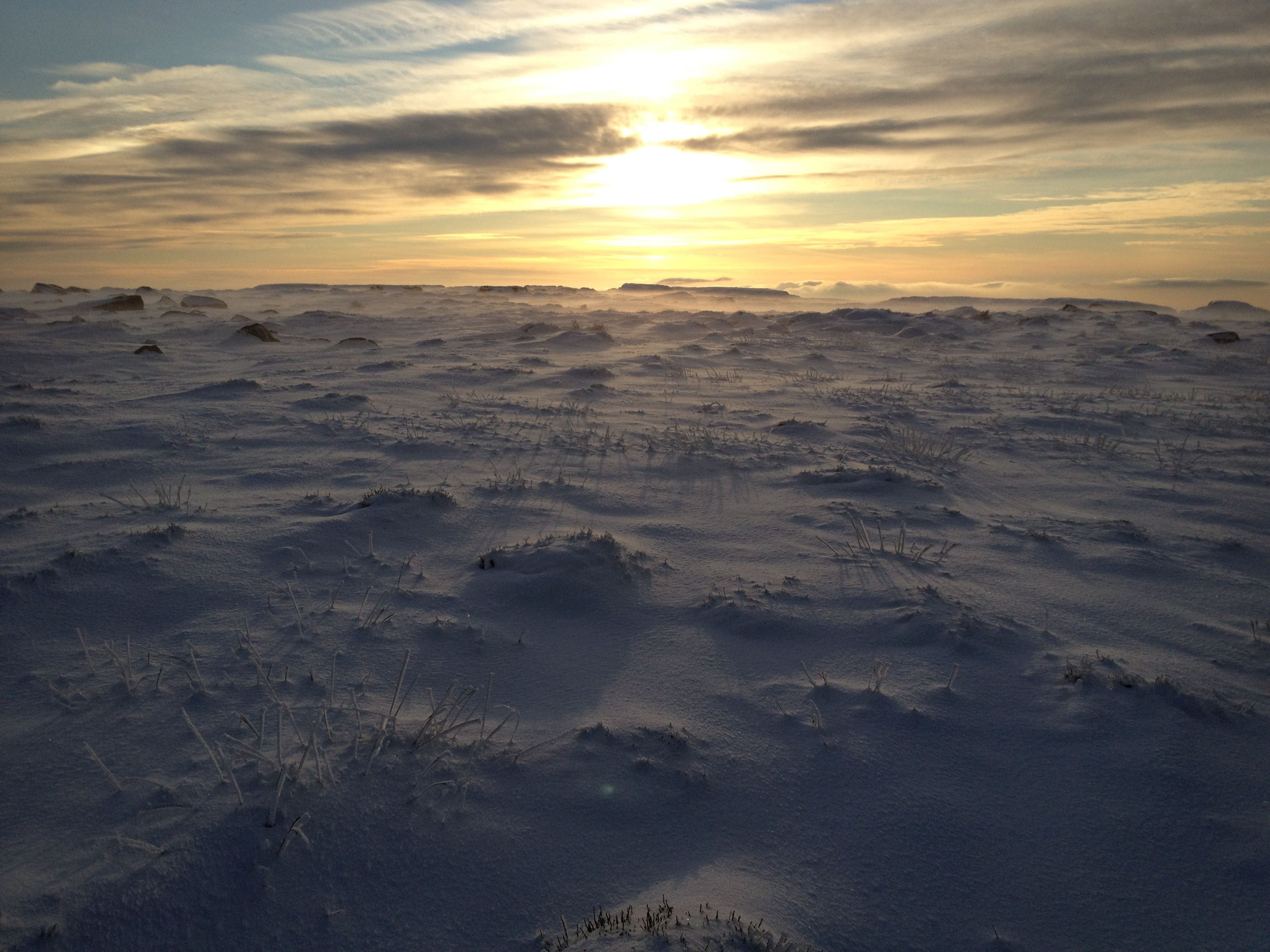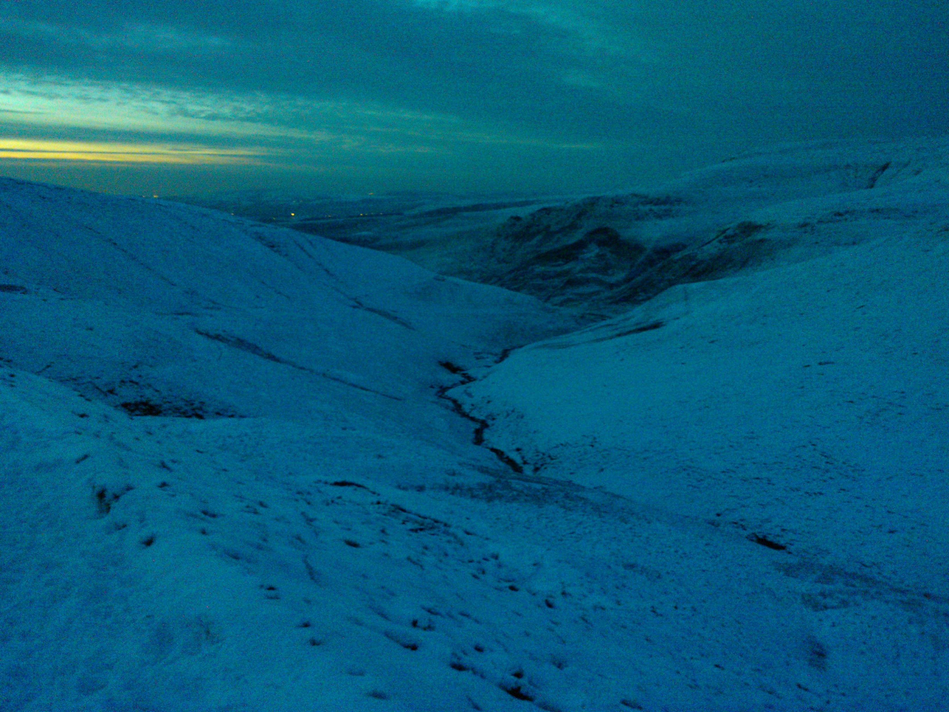 The signal to leave the clough is where it turns sharp left onto Shining Clough Moss. I crossed the beck again and took a bearing on the Pennine Way at Far Moss, occasionally resorting to ViewRanger to confirm my position. Everywhere was white. Completely featureless. A gently undulating sea of snow-covered groughs as far as you could see. The lowering sun was casting an eerie glow on this scene and I felt very alone, and very alive. A fabulous feeling.