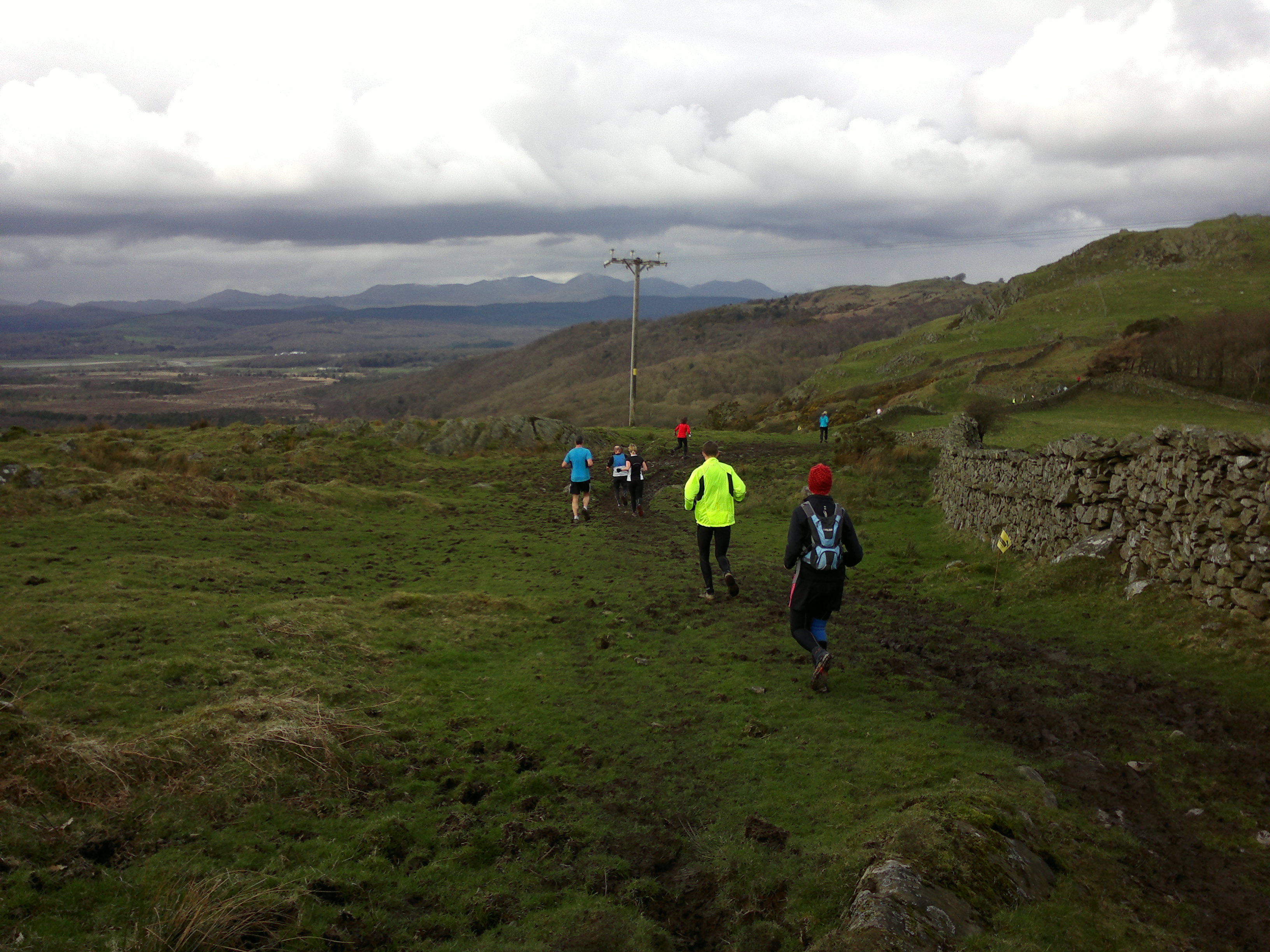 Soon the first climbs kicked-in and the pace, frustratingly, slowed and the heartrate climbed. A few level sections followed, but always interspersed with stiff pulls upwards of 100 ft or so. The view north to the Coniston fells, and behind us to Morecambe Bay, opened out and the running across the fell tops was airy and wonderful.