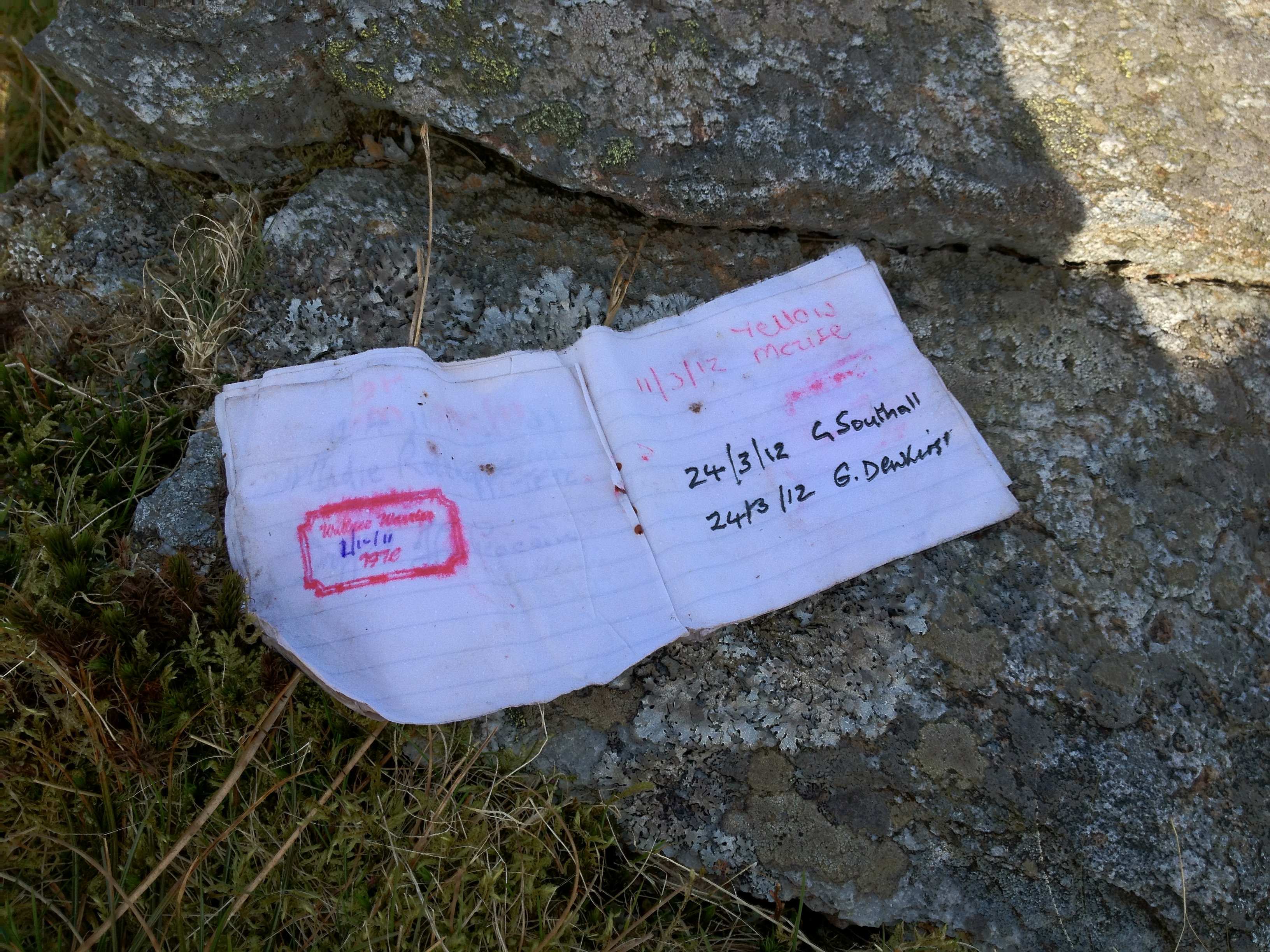 Mountain tops actually make very good spots for hiding caches: they are generally rocky and most muggles concentrate on the very summit cairn or trig – or maybe the crag edges. An innocuous-looking slab of rock close to, but not at, the summit makes a very convenient GZ.