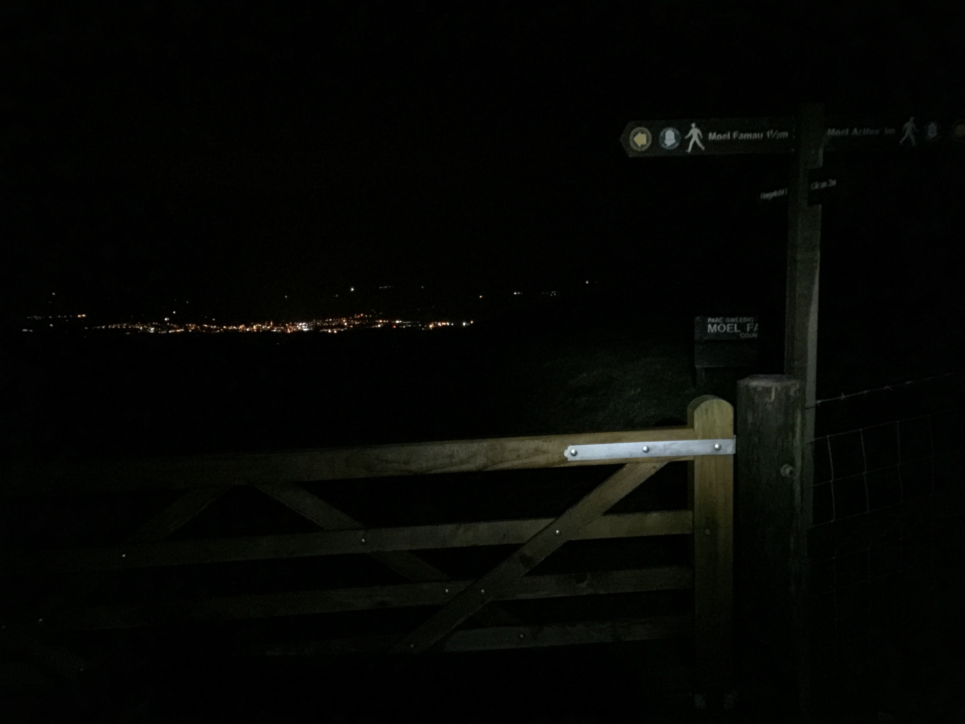 Once out of the cloud I was able to pick up the pace on the descent to Bwlch Penbarras. The lights of Ruthin were amazingly clear against a jet-black night and, though raining steadily, the going was quite pleasurable. I jogged down the road back to Loggereheads and up the final hill to the car. I sat inside and changed shoes and removed outer gear – and listened to the 100% certain rain on the roof. And I smiled.